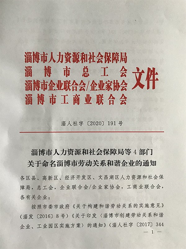 日前,公司順利通過淄博市人力資源和社會保障局、淄博市總工會、淄博市企業聯合會/企業家協會、淄博市工商業聯合會等4部門關于開展淄博市和諧勞動關系考核測評,被評為淄博市模范勞動關系和諧企業。